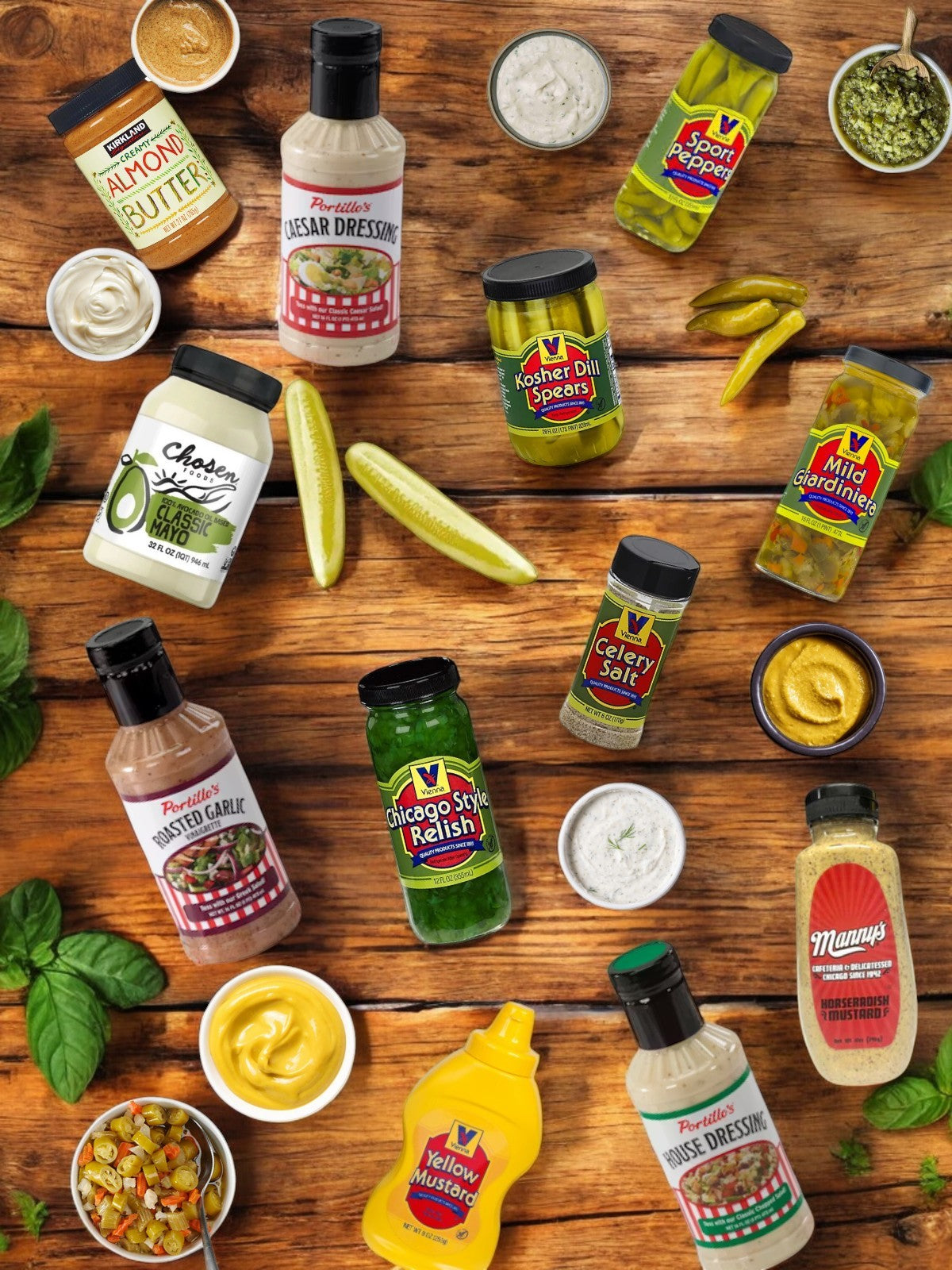 The Vienna Beef Condiment Kit is displayed on a wooden table with a city skyline, evoking the classic Chicago-style hot dog experience.A Vienna Beef Condiment Kit is displayed on a wooden surface, ideal for a Chicago-style hot dog, as the city skyline fades into the background.