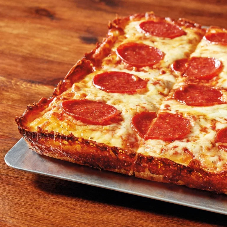 Authentic Motor City Pizza Co. Pepperoni Detroit-Style Pizza features a thick, square crust with a crispy, golden-brown edge and a soft, airy interior. Topped with premium pepperoni, it’s layered with a rich, tangy tomato sauce and a generous amount of melted mozzarella and Wisconsin brick cheese, which caramelizes against the edges for a signature crunchy, cheesy finish. This Detroit-style pizza delivers a satisfying blend of bold flavors and textures, making it the perfect choice for pizza lovers craving a hearty, indulgent slice.